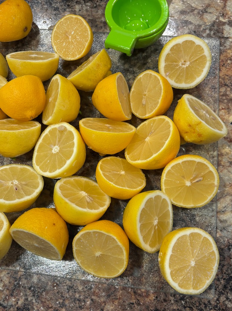 On a glass cutting board, slice all of your lemons in half.