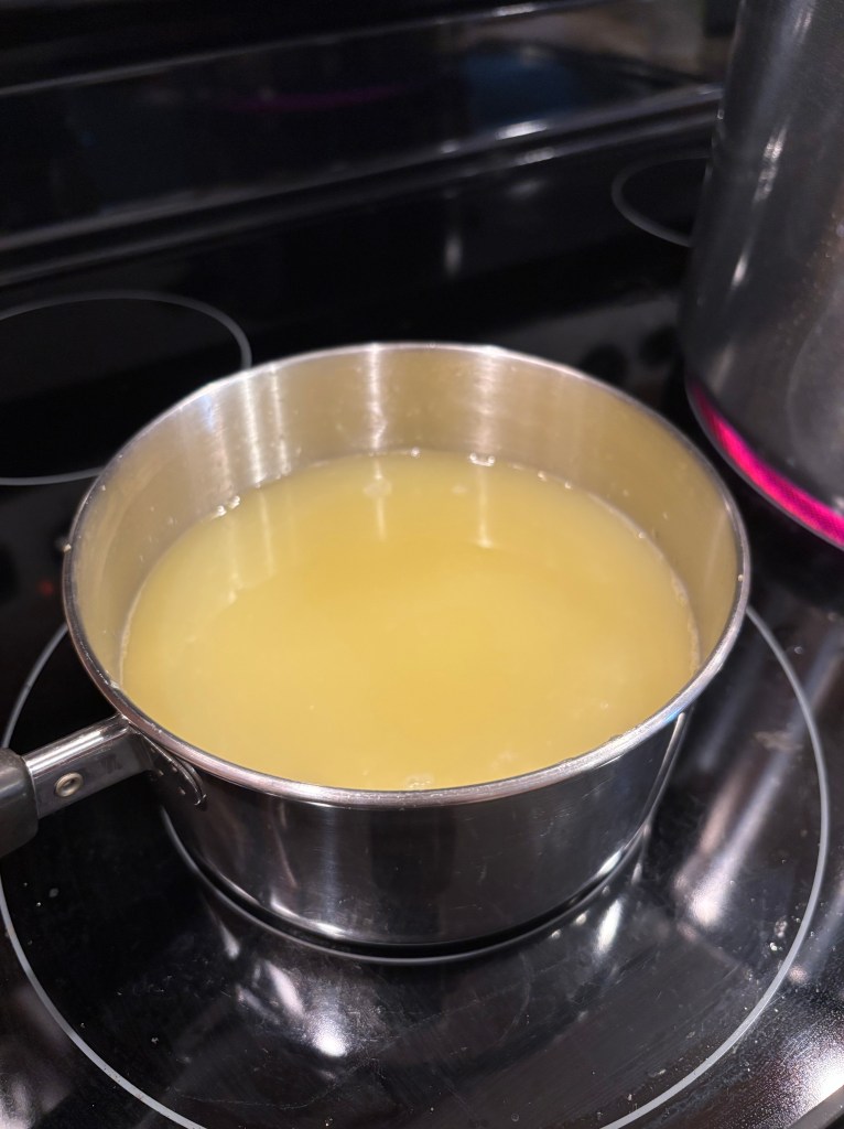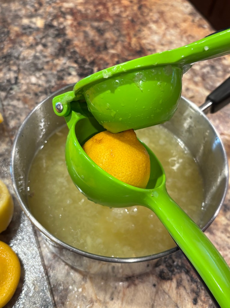Using lemon juicer, juice all of the lemons into a pan. Make sure to get all of the juice so none is left behind! You can either use a hand juicer like I did or try this electric juicer to speed up the process!