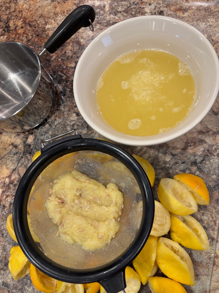 Once all of the lemons have been squeezed / juiced, it’s time to strain out the pulp and seeds. Using a stainless steel mesh strainer, pour the squeezed product into another bowl. You may save the pulp for a later recipe if you would like.