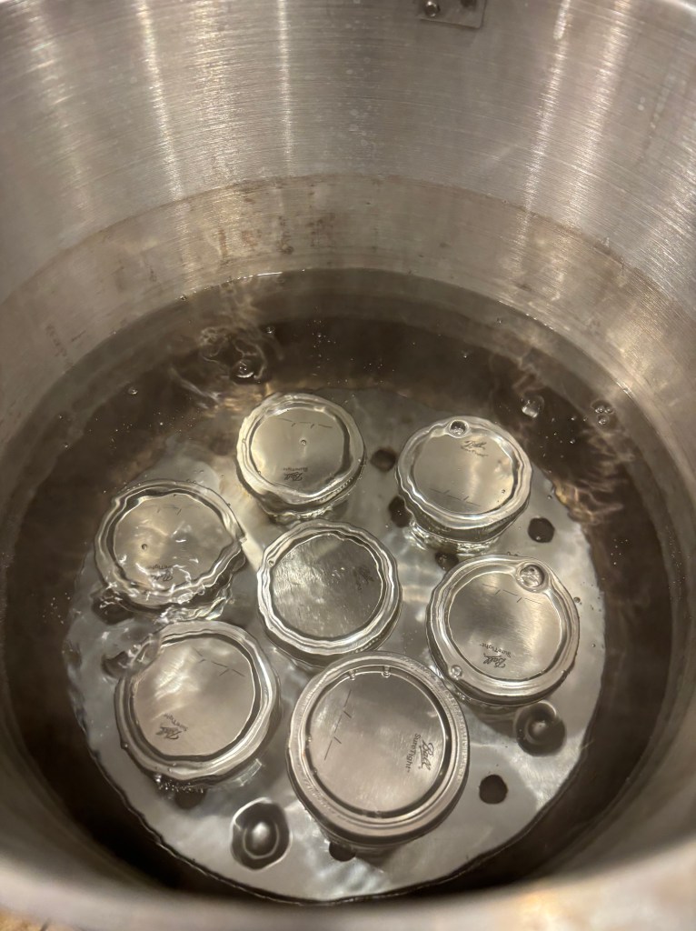 Fill your canner with about 3-5 quarts of hot water and bring to a boil. You only need enough water to cover the jars with two inches of water. When the water starts to boil, add the jars using your jar lifter. Keep the water boiling and boil for 5-10 minutes. This juice is able to be processed with the hot water method rather than pressure canning due to the acidity in the juice.