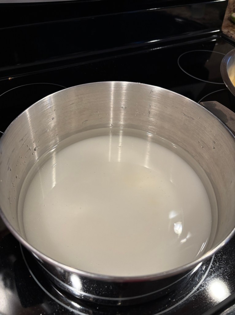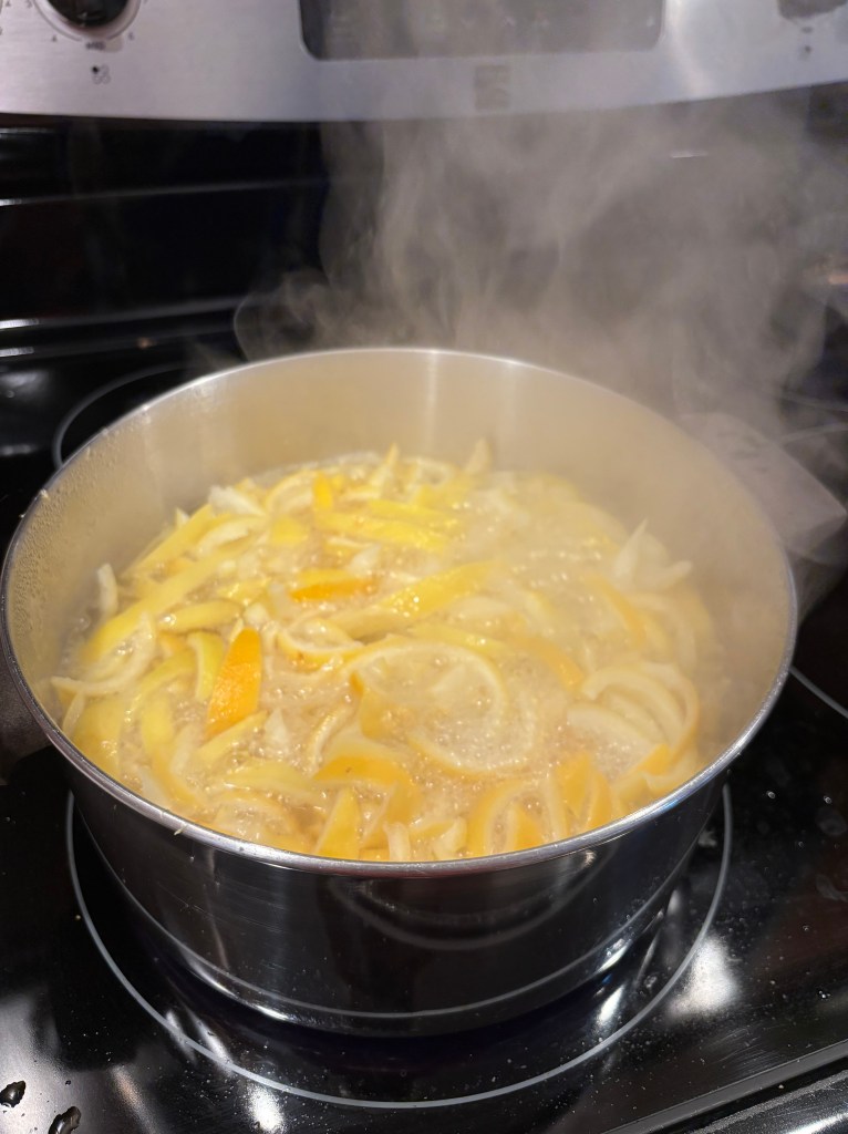 The peels will need to simmer in the sugar water for 30-90 minutes, depending on how many peels and sugar water you have. Make sure to stir occasionally. It will be done when the peels become translucent and the sugar water turns yellow and starts to thicken. You can also eat a peel – if they are still bitter, try simmering for a little longer.