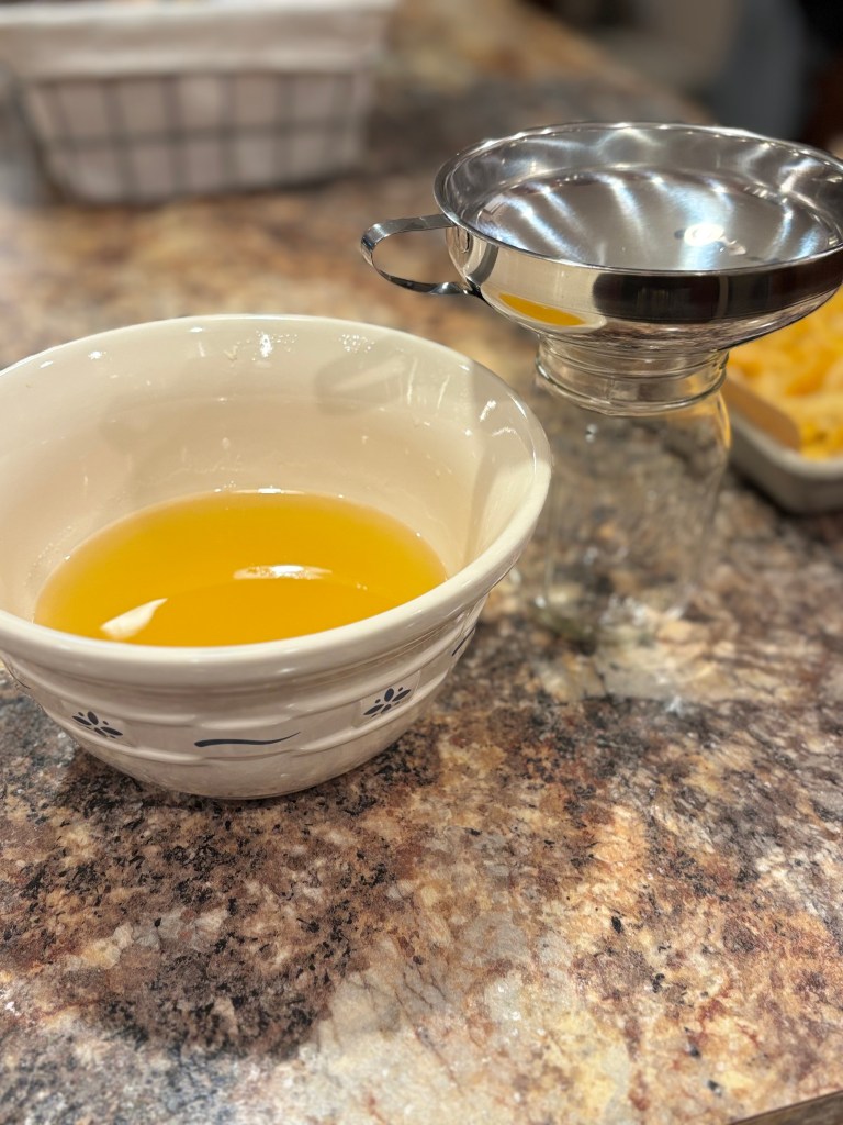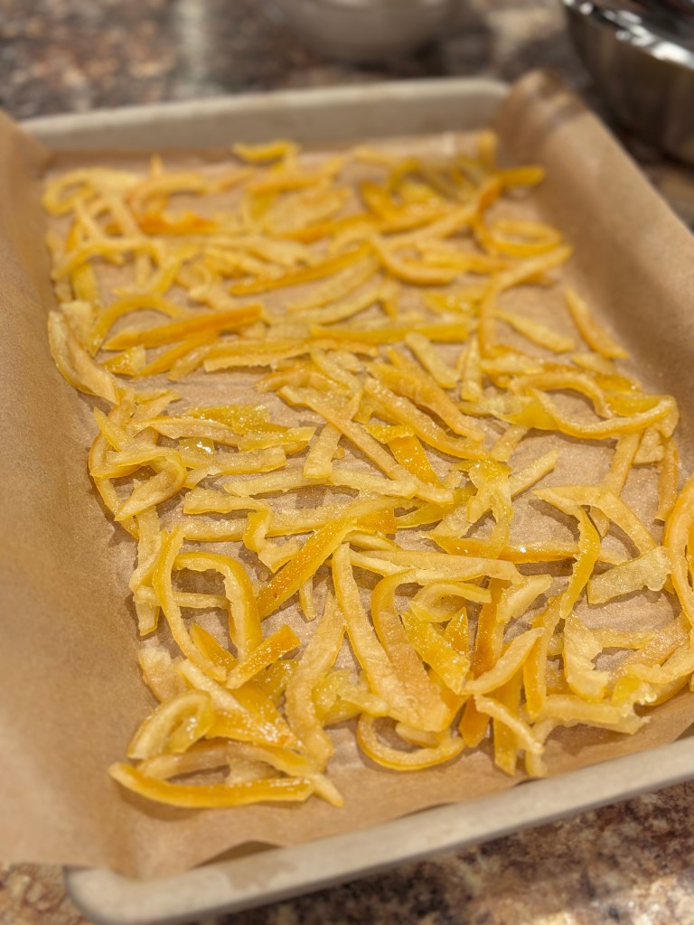 Once cooked, pour the peels and liquid through a strainer into ceramic bowl. Take the peels and lay them out on a sheet pan lined with parchment paper to dry.