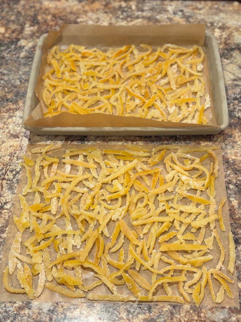 After about 15-30 minutes, the peels should be dry and sticky. Now it’s time to coat them in sugar. You can either roll them in sugar in a bowl or shake them in sugar in a bag. I rolled mine in a bowl of sugar then lay them back out on the parchment paper. Leave them sit out for several hours to finish drying.